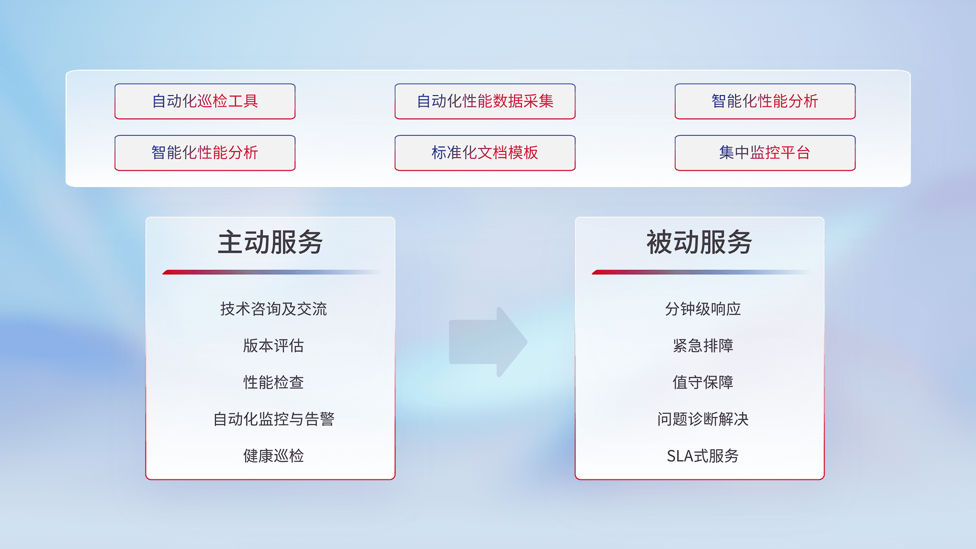 智能化工具和标准化文档,,保障服务质量,,提供主动服务(包含技术咨询、、、版本评估、、性能检查、、自动化监控与告警、、健康巡检)和被动服务包含(分钟级响应、、、紧急排障、、、、值守保障、、、问题诊断解决、、、SLA服务)。。。。