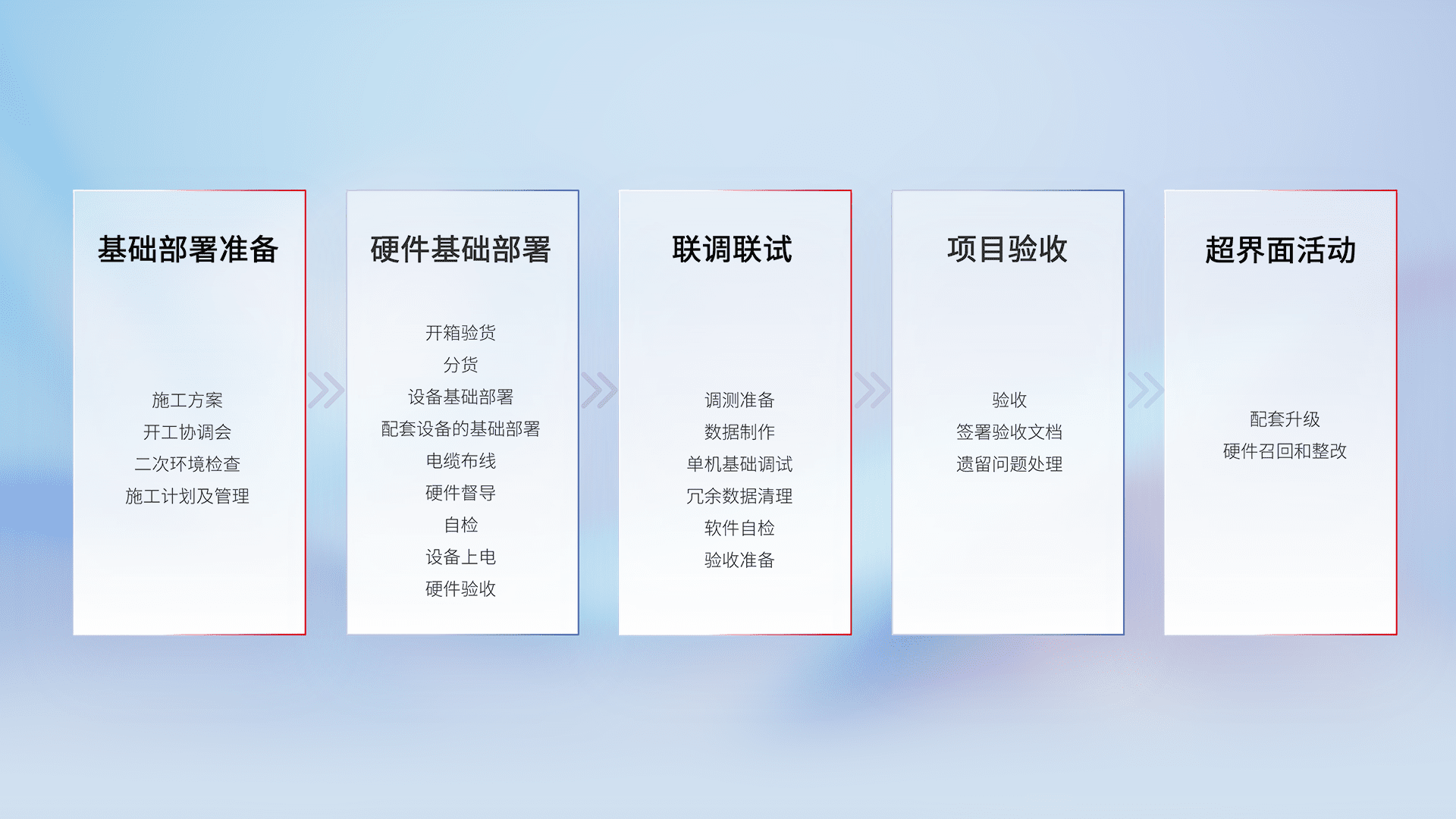 从基础部署准备、、硬件基础部署、、、、联调联试、、、项目验收、、、、越界面活动的全过程可追溯,,保证施工质量和进度。。。